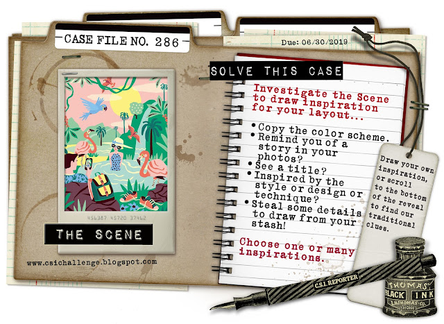 How Tammy solved the Case: I cracked the case as follows: I used the colours, and the testimony as I scrapped a summer vacation. For the evidence I used the following: pattern with leaves, flowers, stripes, sun, clouds, bird, wet medium, sunglasses